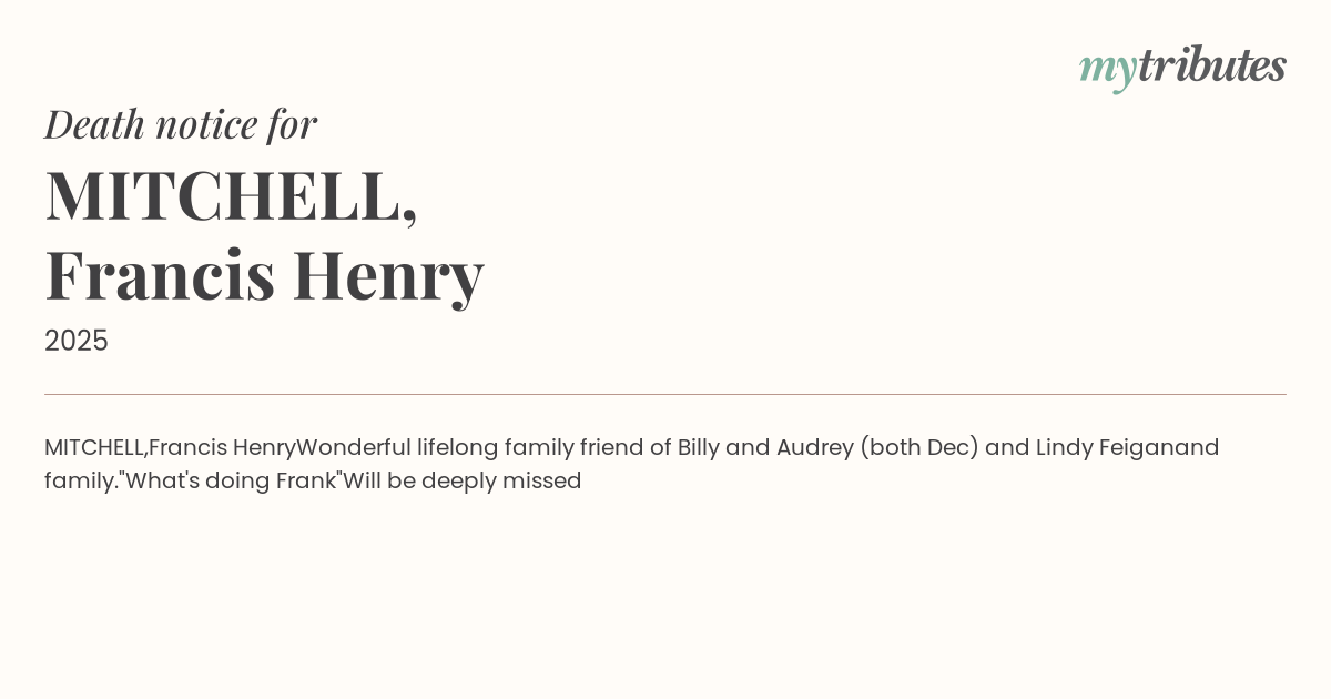 Wonderful lifelong family friend of Billy and Audrey (both Dec) and Lindy Feigan