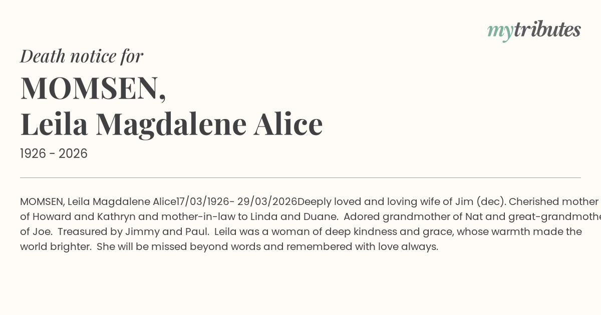Deeply loved and loving wife of Jim (dec). Cherished mother of Howard and Kathryn and mother-in-law to Linda and Duane. Adored grandmother of Nat and great-grandmother of Joe. Treasured by Jimmy and Paul. Leila was a woman of deep kindness and grace, whose warmth made the world brighter. She will be missed beyond words and remembered with love always.