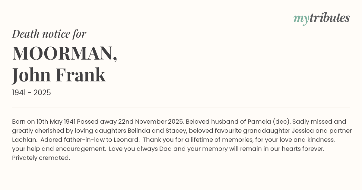 15°CBorn on 10th May 1941 Passed away 22nd November 2025. Beloved husband of Pamela (dec). Sadly missed and greatly cherished by loving daughters Belinda and Stacey, beloved favourite granddaughter Jessica and partner Lachlan. Adored father-in-law to Leonard. Thank you for a lifetime of memories, for your love and kindness, your help and encouragement. Love you always Dad and your memory will remain in our hearts forever. Privately cremated.