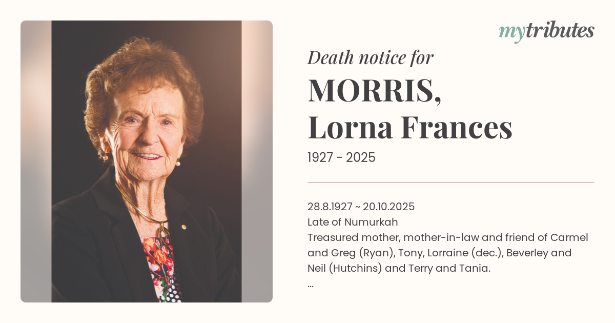 Treasured mother, mother-in-law and friend of Carmel and Greg (Ryan), Tony, Lorraine (dec.), Beverley and Neil (Hutchins) and Terry and Tania.