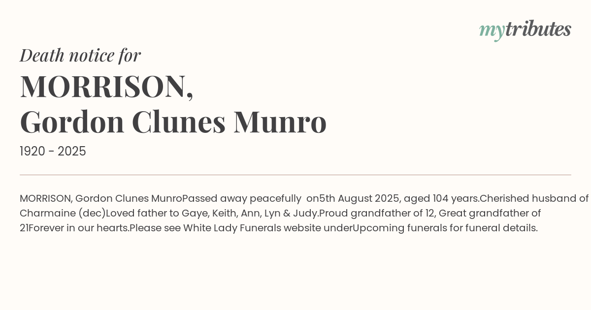 Loved father to Gaye, Keith, Ann, Lyn & Judy.
