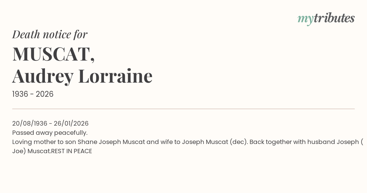 Passed away peacefully. Loving mother to son Shane Joseph Muscat and wife to Joseph Muscat (dec). Back together with husband Joseph ( Joe) Muscat.