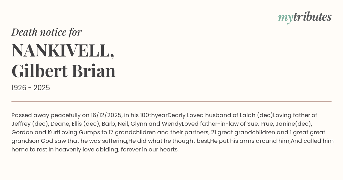 15°CPassed away peacefully on 16/12/2025, in his 100thyear