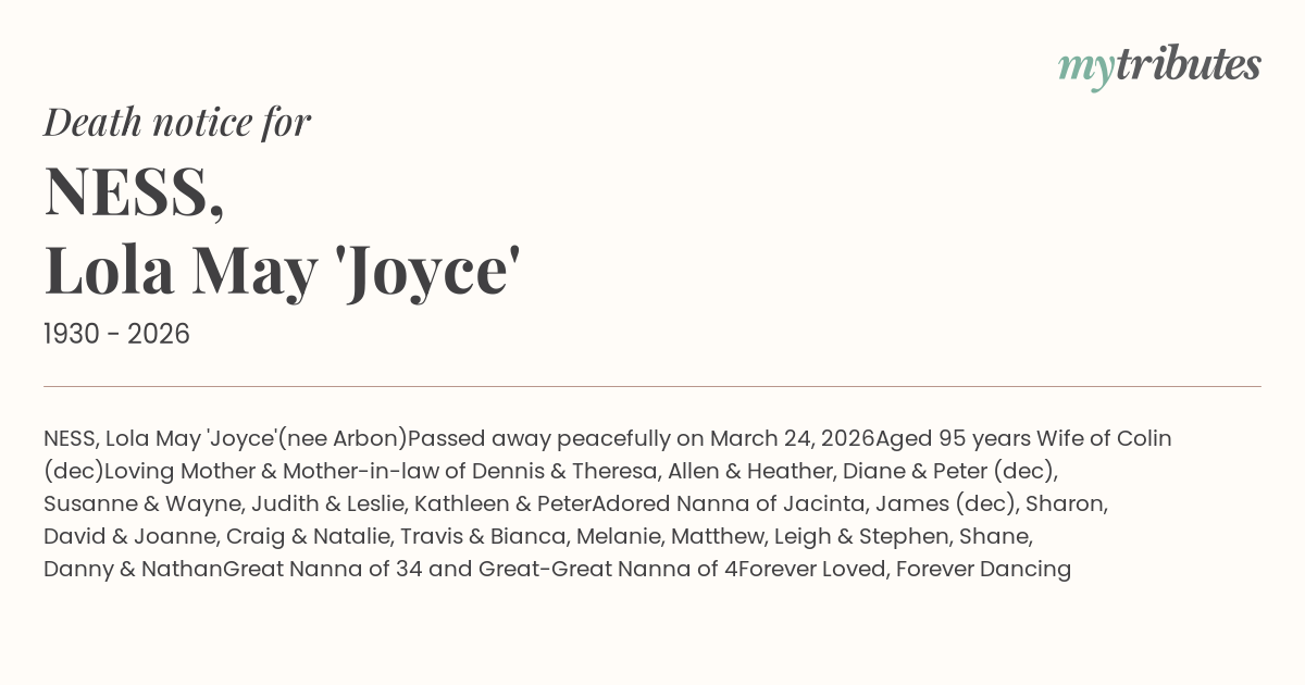 Adored Nanna of Jacinta, James (dec), Sharon, David & Joanne, Craig & Natalie, Travis & Bianca, Melanie, Matthew, Leigh & Stephen, Shane, Danny & Nathan