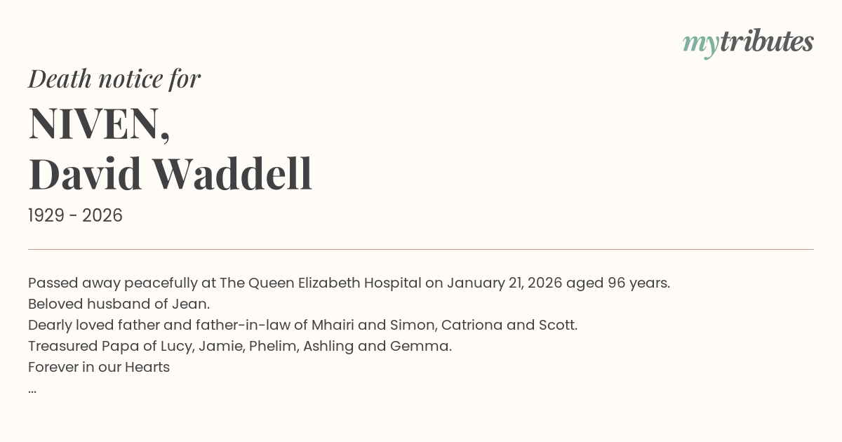 15°CPassed away peacefully at The Queen Elizabeth Hospital on January 21, 2026 aged 96 years. Beloved husband of Jean. Dearly loved father and father-in-law of Mhairi and Simon, Catriona and Scott. Treasured Papa of Lucy, Jamie, Phelim, Ashling and Gemma. Forever in our Hearts Please refer to Simplicity Funerals website for funeral details and live streaming link.
