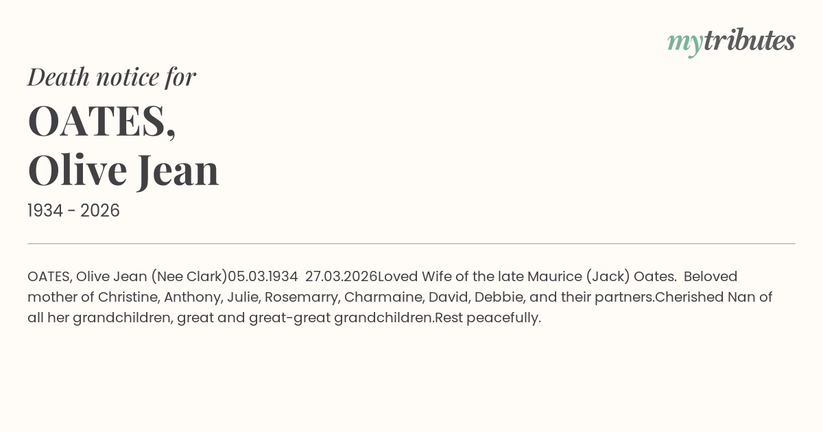 Loved Wife of the late Maurice (Jack) Oates. Beloved mother of Christine, Anthony, Julie, Rosemarry, Charmaine, David, Debbie, and their partners.