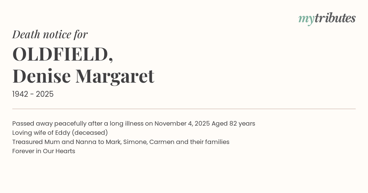 15°CPassed away peacefully after a long illness on November 4, 2025 Aged 82 years