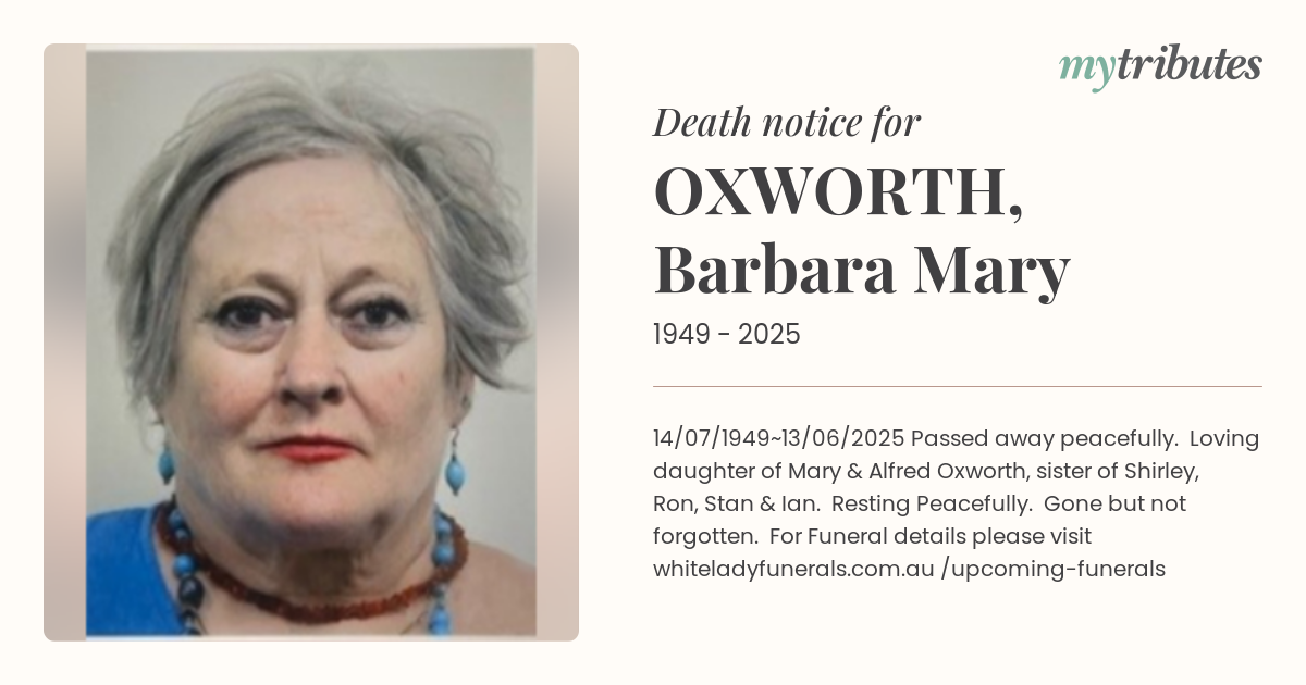 15°C14/07/1949~13/06/2025 Passed away peacefully. Loving daughter of Mary & Alfred Oxworth, sister of Shirley, Ron, Stan & Ian. Resting Peacefully. Gone but not forgotten. For Funeral details please visit whiteladyfunerals.com.au /upcoming-funerals