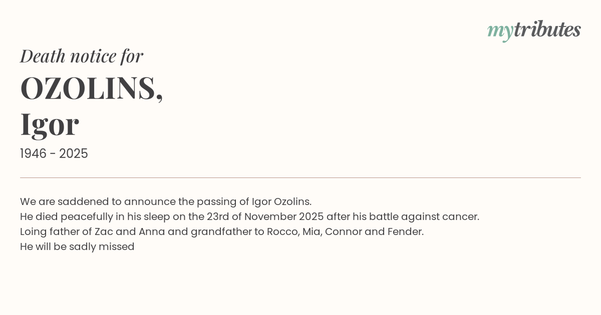 15°CWe are saddened to announce the passing of Igor Ozolins.