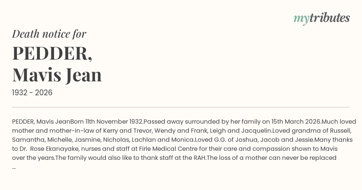 Loved grandma of Russell, Samantha, Michelle, Jasmine, Nicholas, Lachlan and Monica.
