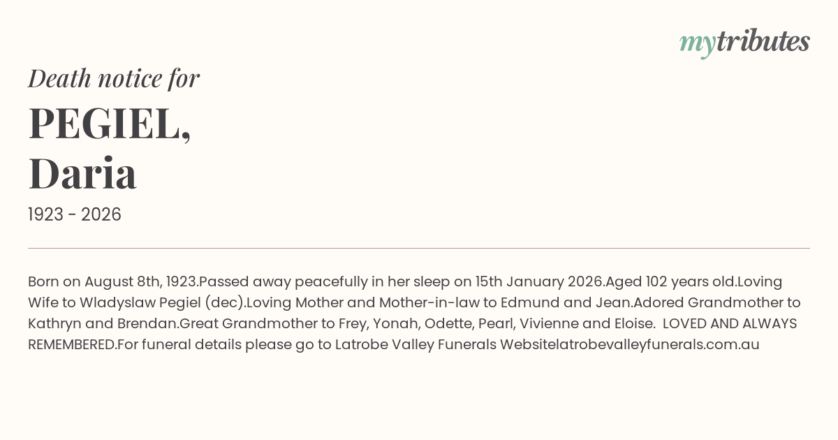 For funeral details please go to Latrobe Valley Funerals Website
