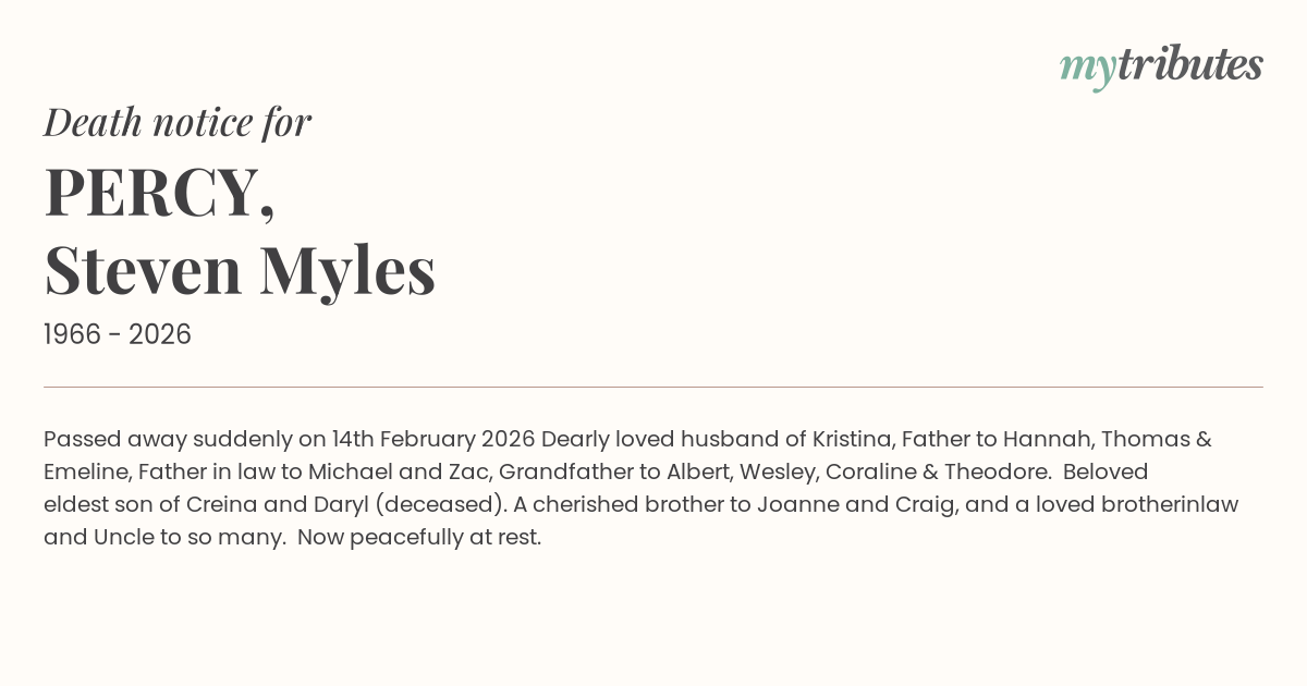 15°CPassed away suddenly on 14th February 2026 Dearly loved husband of Kristina, Father to Hannah, Thomas & Emeline, Father in law to Michael and Zac, Grandfather to Albert, Wesley, Coraline & Theodore. Beloved eldest son of Creina and Daryl (deceased). A cherished brother to Joanne and Craig, and a loved brother‐in‐law and Uncle to so many. Now peacefully at rest.