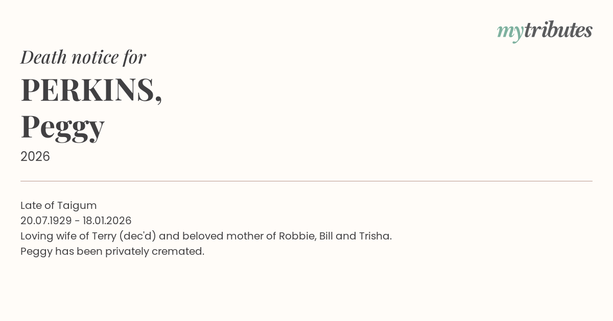 Loving wife of Terry (dec'd) and beloved mother of Robbie, Bill and Trisha. Peggy has been privately cremated.