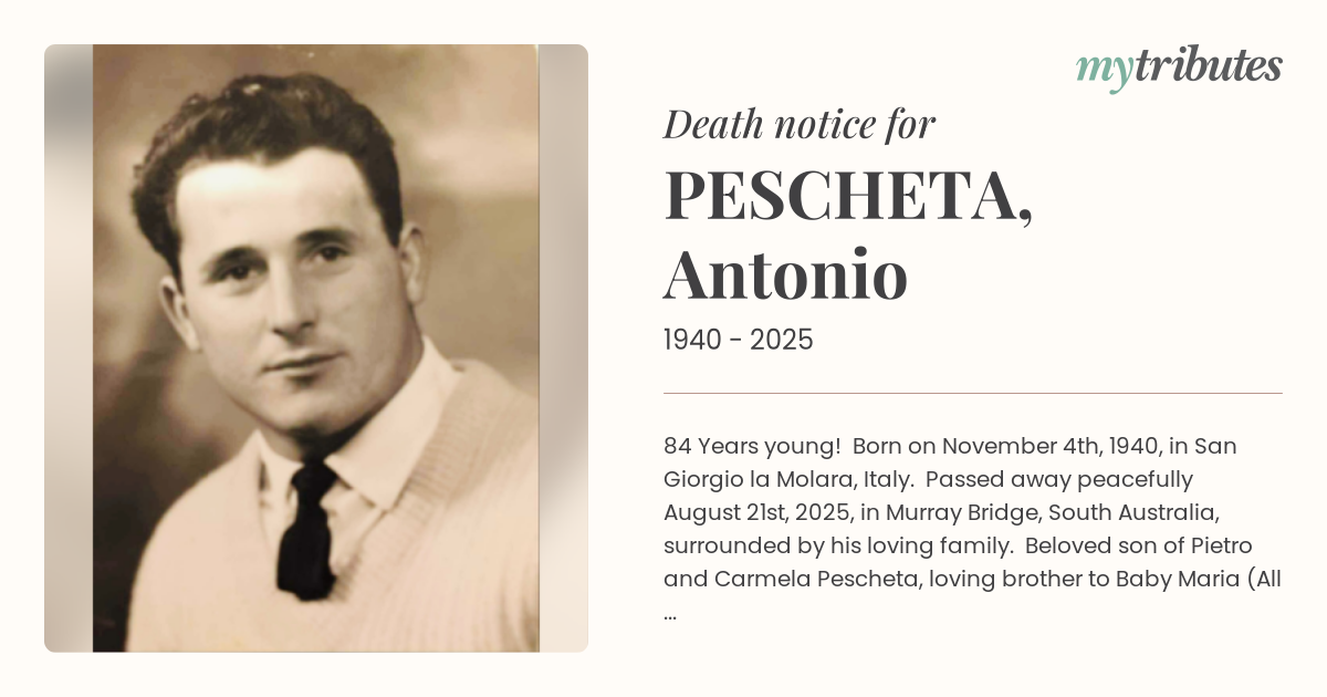 15°C84 Years young! Born on November 4th, 1940, in San Giorgio la Molara, Italy. Passed away peacefully August 21st, 2025, in Murray Bridge, South Australia, surrounded by his loving family. Beloved son of Pietro and Carmela Pescheta, loving brother to Baby Maria (All deceased) A devoted and beloved husband to Camilla of 68 years. A proud and dedicated father to Carmelina, Crestina and Lucia.