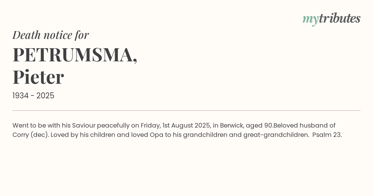 15°CWent to be with his Saviour peacefully on Friday, 1st August 2025, in Berwick, aged 90.Beloved husband of Corry (dec). Loved by his children and loved Opa to his grandchildren and great-grandchildren. Psalm 23.
