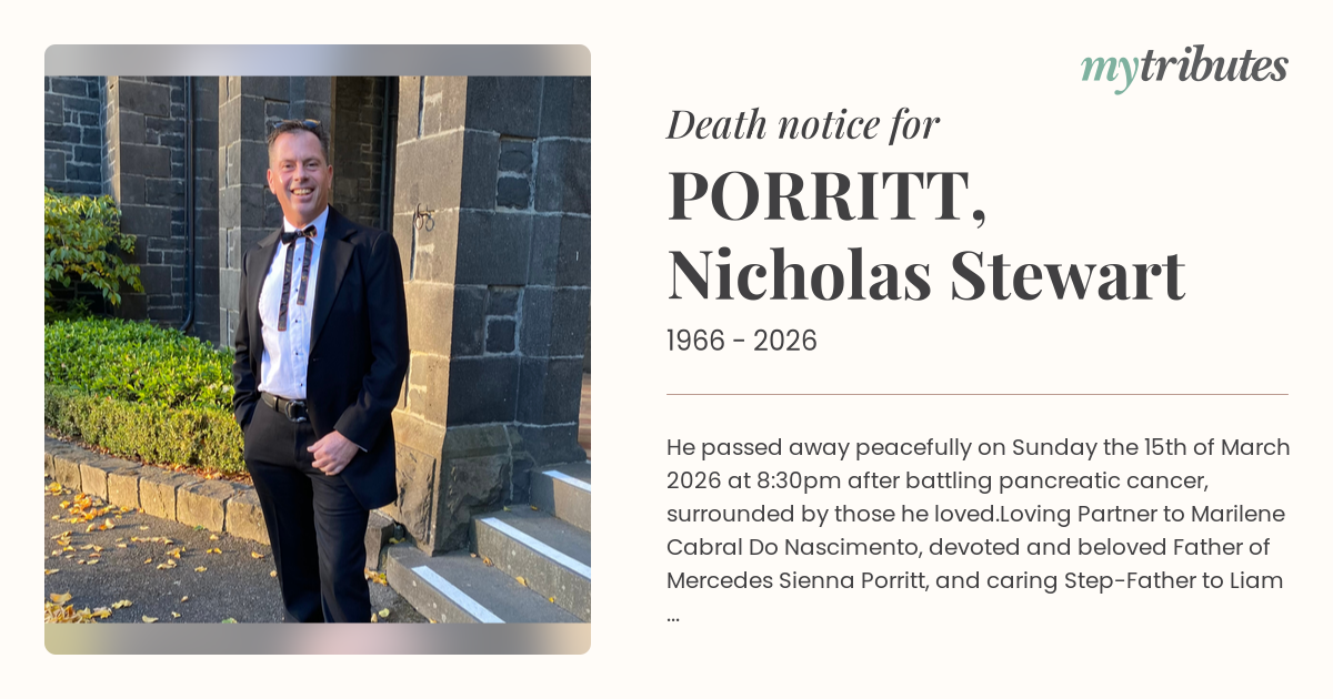 15°CHe passed away peacefully on Sunday the 15th of March 2026 at 8:30pm after battling pancreatic cancer, surrounded by those he loved.