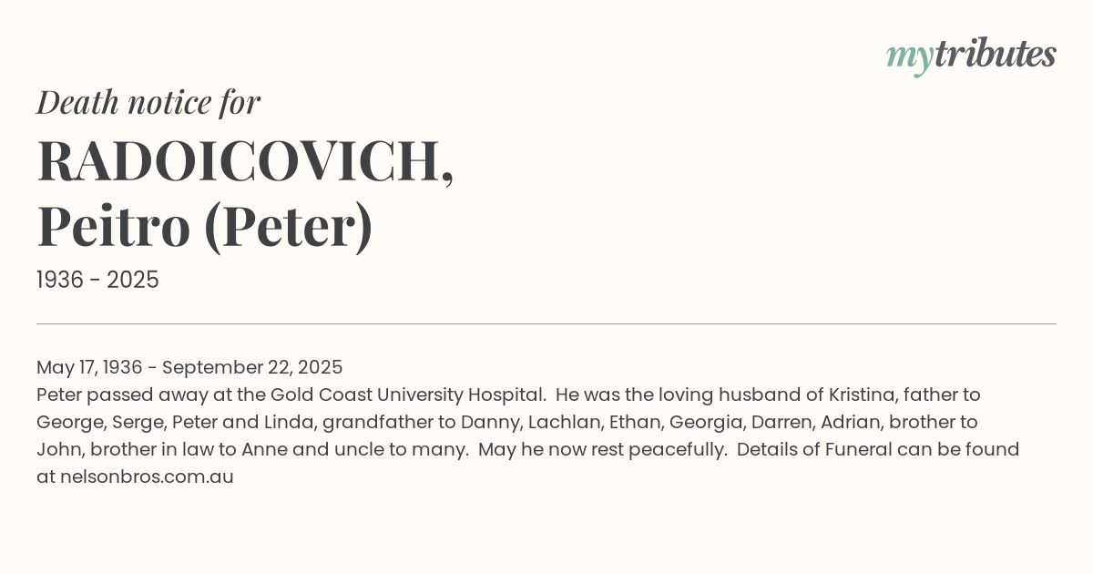 Peter passed away at the Gold Coast University Hospital. He was the loving husband of Kristina, father to George, Serge, Peter and Linda, grandfather to Danny, Lachlan, Ethan, Georgia, Darren, Adrian, brother to John, brother in law to Anne and uncle to many.