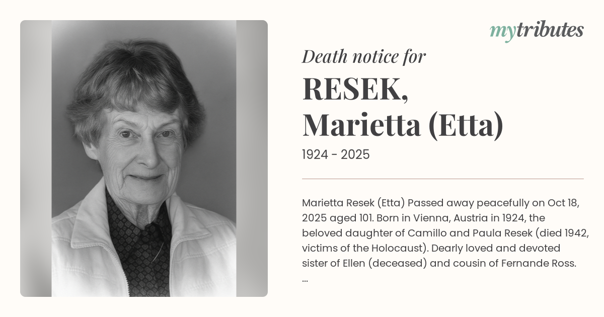 Born in Vienna, Austria in 1924, the beloved daughter of Camillo and Paula Resek (died 1942, victims of the Holocaust).