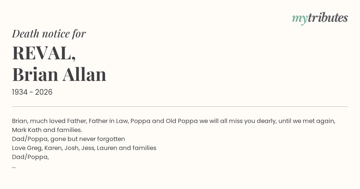 15°CBrian, much loved Father, Father in Law, Poppa and Old Poppa we will all miss you dearly, until we met again, Mark Kath and families.