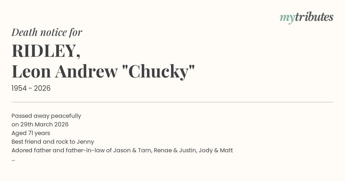15°CPassed away peacefully on 29th March 2026 Aged 71 years Best friend and rock to Jenny Adored father and father-in-law of Jason & Tam, Renae & Justin, Jody & Matt Cherished Papa of Jett, Levi and Ava; Bailey, Isaak, Tahlia, Miah and Kaiden; Chase and Billy