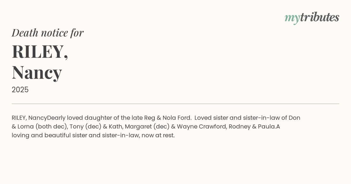 Dearly loved daughter of the late Reg & Nola Ford. Loved sister and sister-in-law of Don & Lorna (both dec), Tony (dec) & Kath, Margaret (dec) & Wayne Crawford, Rodney & Paula.