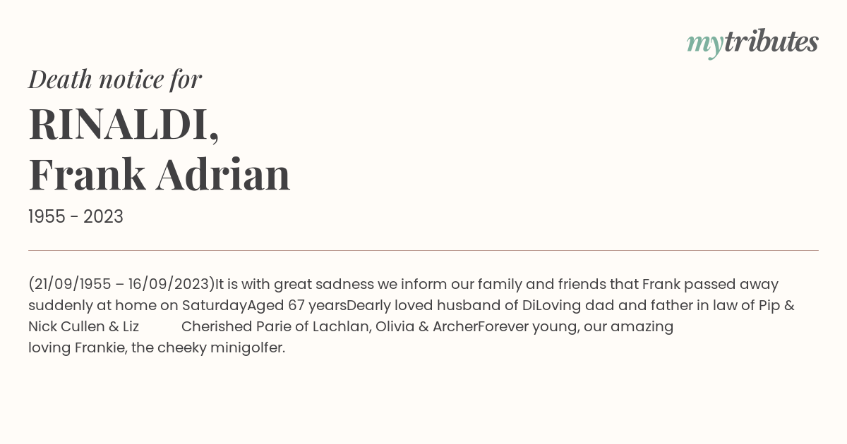 It is with great sadness we inform our family and friends that Frank passed away suddenly at home on Saturday
