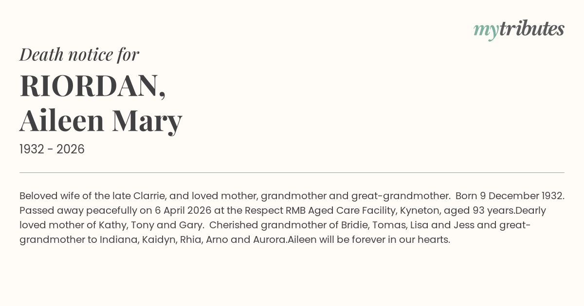 Passed away peacefully on 6 April 2026 at the Respect RMB Aged Care Facility, Kyneton, aged 93 years.