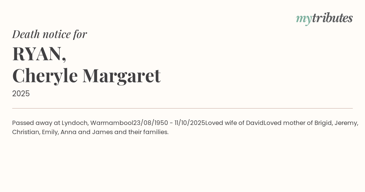 Loved mother of Brigid, Jeremy, Christian, Emily, Anna and James and their families.