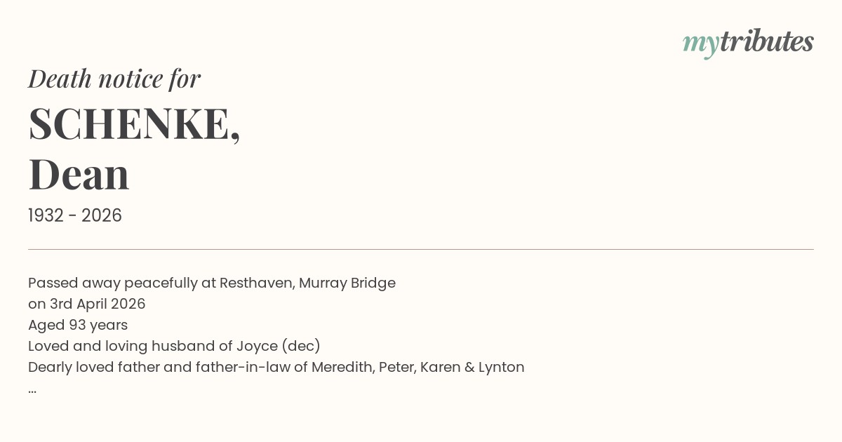 15°CPassed away peacefully at Resthaven, Murray Bridge
