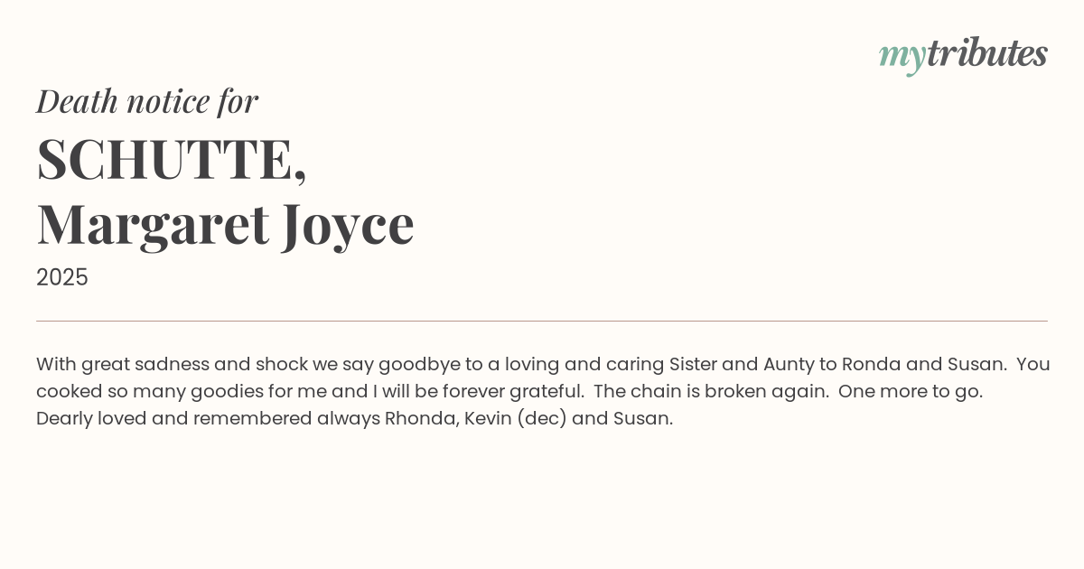 15°CWith great sadness and shock we say goodbye to a loving and caring Sister and Aunty to Ronda and Susan. You cooked so many goodies for me and I will be forever grateful. The chain is broken again. One more to go.
