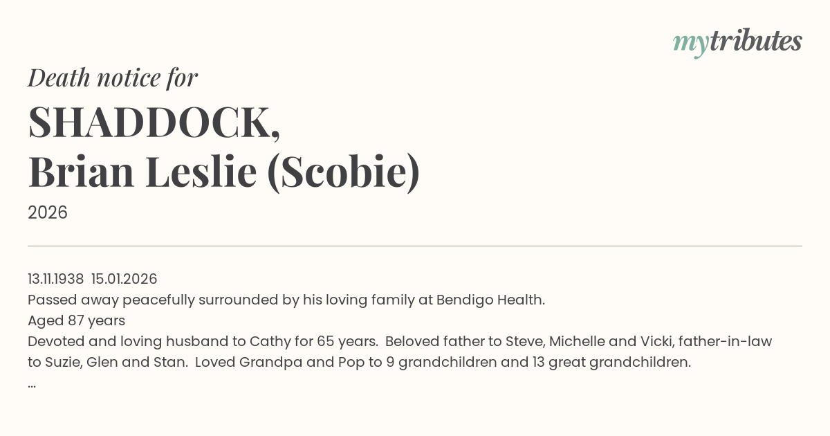 Passed away peacefully surrounded by his loving family at Bendigo Health.