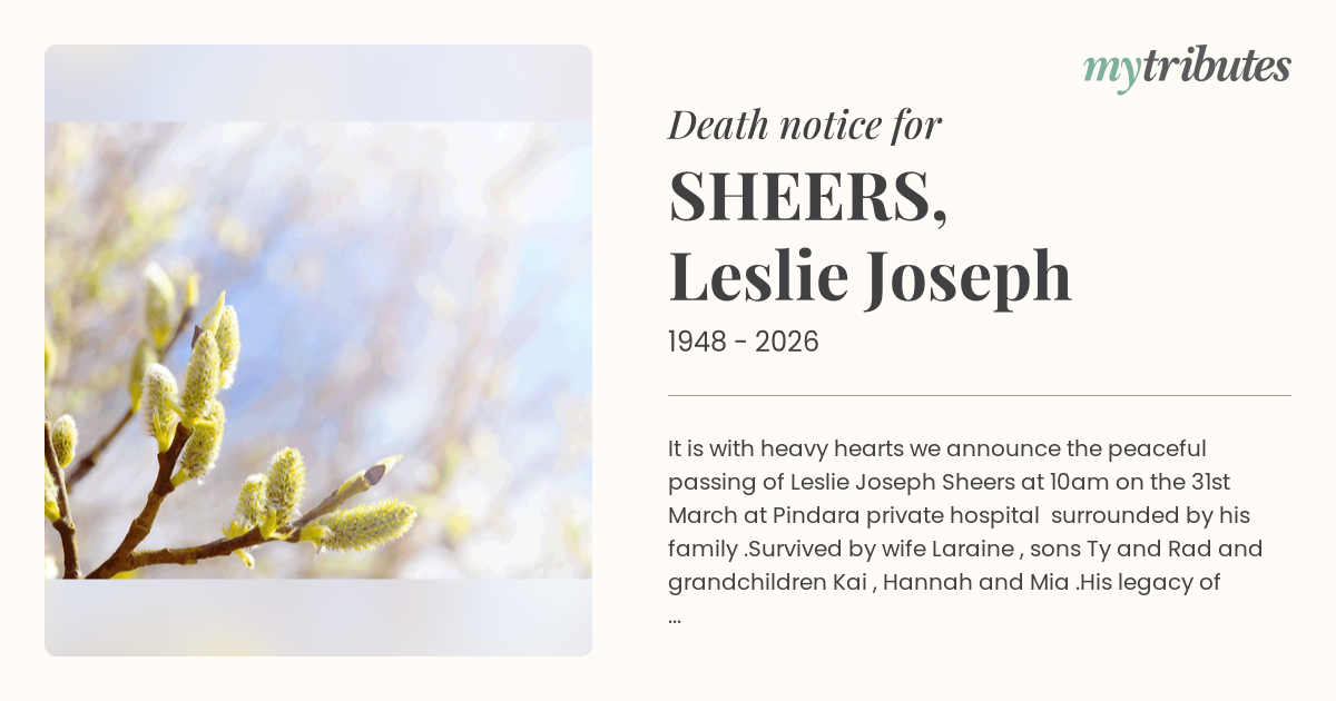 15°CIt is with heavy hearts we announce the peaceful passing of Leslie Joseph Sheers at 10am on the 31st March at Pindara private hospital surrounded by his family .