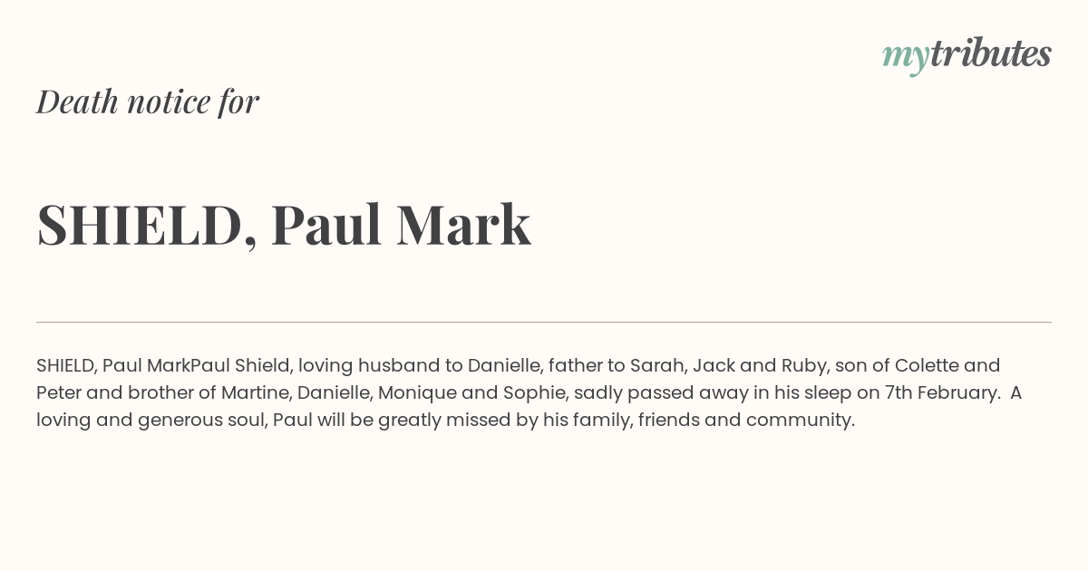 Paul Shield, loving husband to Danielle, father to Sarah, Jack and Ruby, son of Colette and Peter and brother of Martine, Danielle, Monique and Sophie, sadly passed away in his sleep on 7th February. A loving and generous soul, Paul will be greatly missed by his family, friends and community.