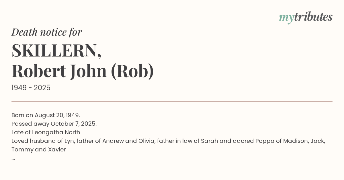 Loved husband of Lyn, father of Andrew and Olivia, father in law of Sarah and adored Poppa of Madison, Jack, Tommy and Xavier