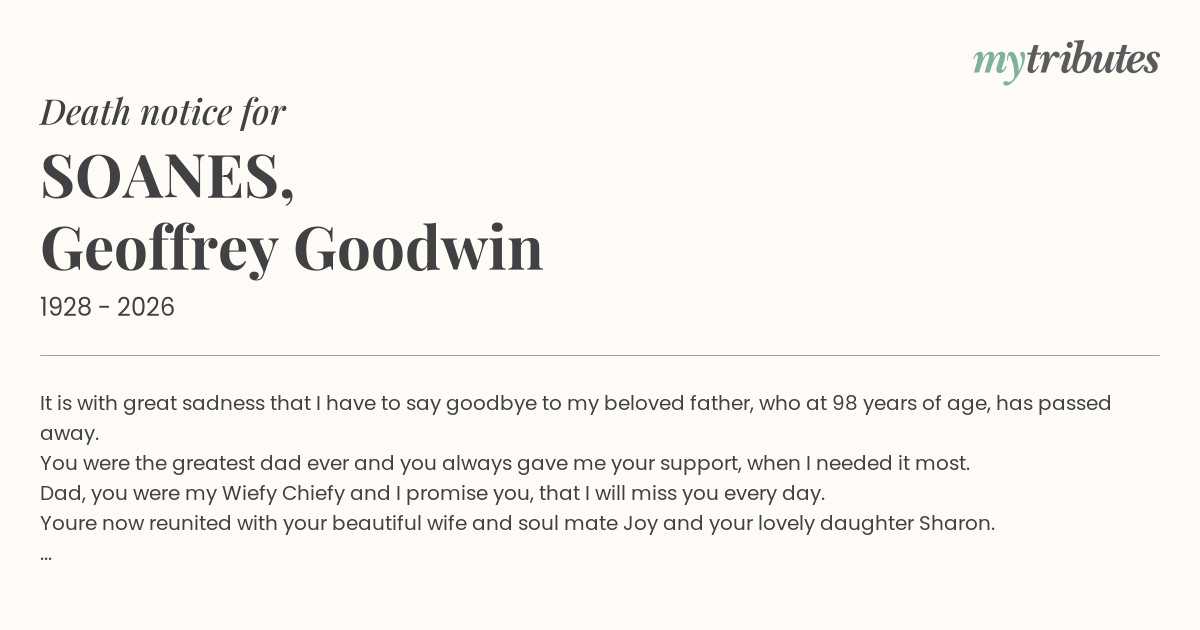 15°CIt is with great sadness that I have to say goodbye to my beloved father, who at 98 years of age, has passed away.