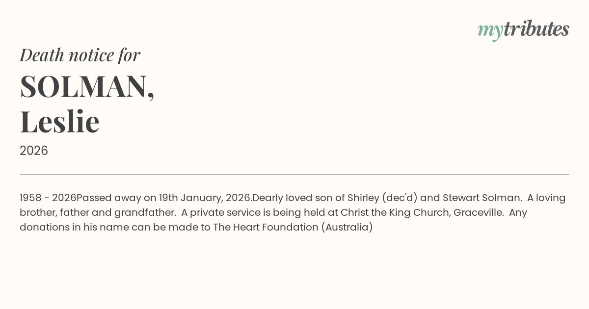 Dearly loved son of Shirley (dec'd) and Stewart Solman.