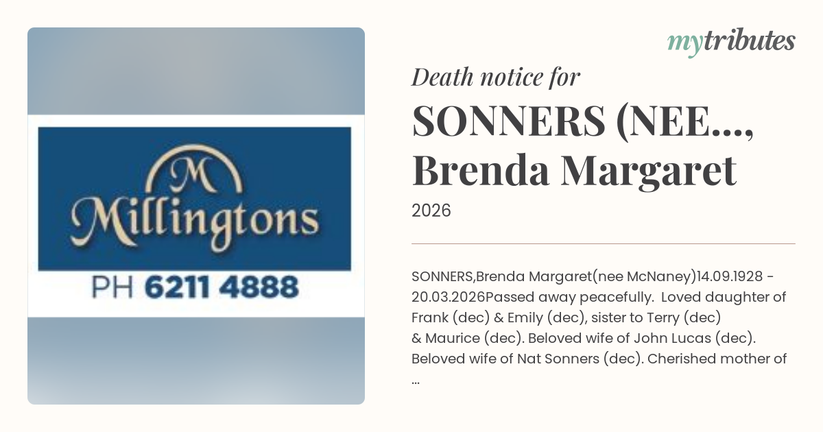 Passed away peacefully. Loved daughter of Frank (dec) & Emily (dec), sister to Terry (dec) & Maurice (dec). Beloved wife of John Lucas (dec). Beloved wife of Nat Sonners (dec). Cherished mother of Karen, Jenny & Greta and mother-in-law to Russell (dec), Greg & Michael. Adored Nanny to Adam, Diana, Ryan,Eve & Thomas. Great-grandmother to Grace & Stella.