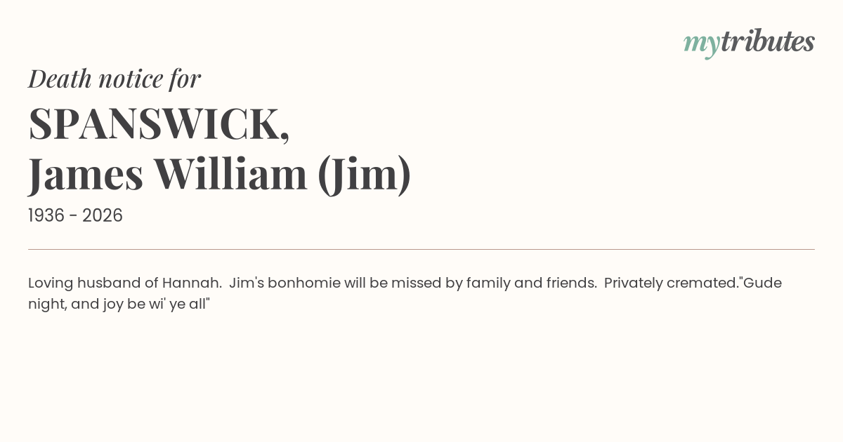 15°CLoving husband of Hannah. Jim's bonhomie will be missed by family and friends. Privately cremated.