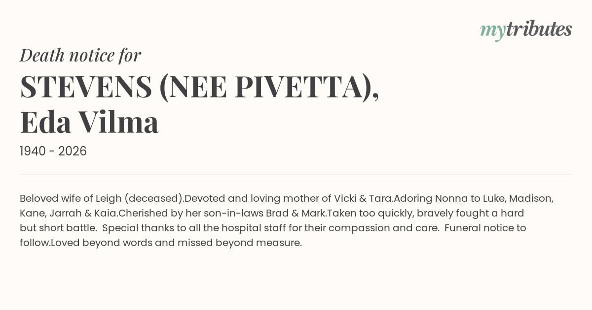 Taken too quickly, bravely fought a hard but short battle. Special thanks to all the hospital staff for their compassion and care. Funeral notice to follow.