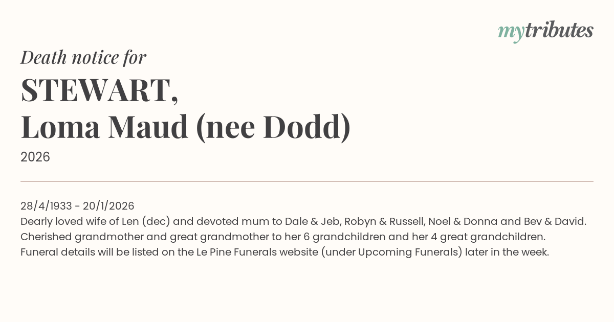 Funeral details will be listed on the Le Pine Funerals website (under Upcoming Funerals) later in the week.