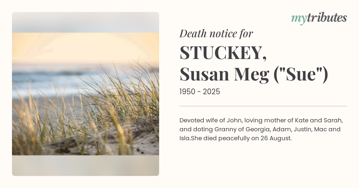 15°CDevoted wife of John, loving mother of Kate and Sarah, and doting Granny of Georgia, Adam, Justin, Mac and Isla.