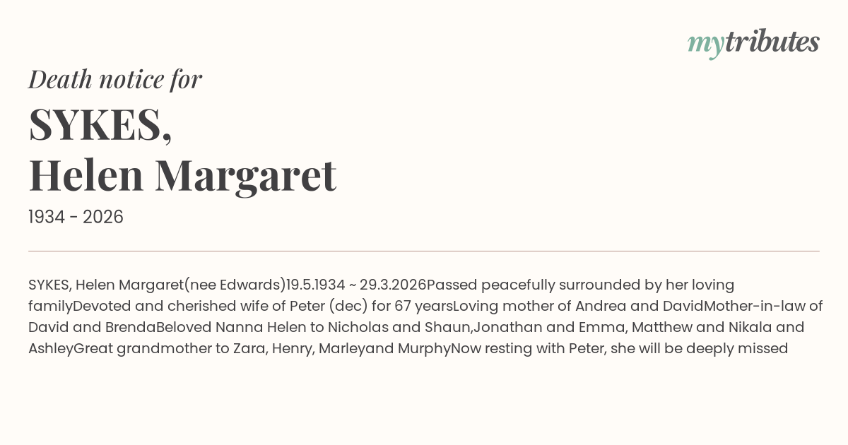 Beloved Nanna Helen to Nicholas and Shaun,
