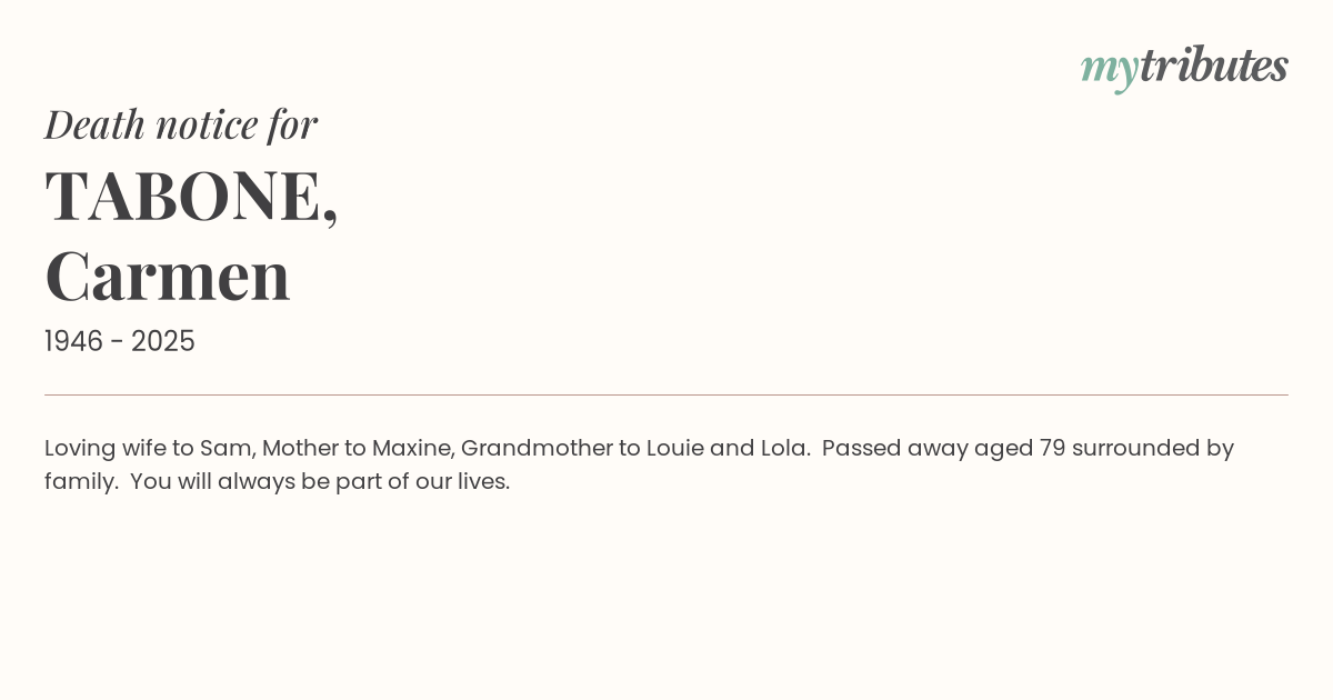 15°CLoving wife to Sam, Mother to Maxine, Grandmother to Louie and Lola. Passed away aged 79 surrounded by family. You will always be part of our lives.