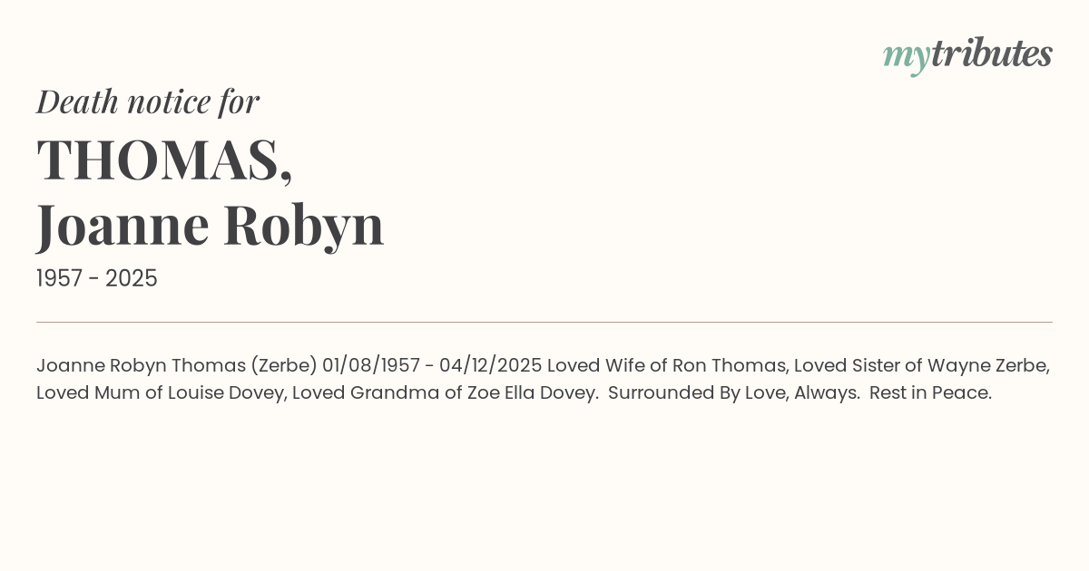 15°CJoanne Robyn Thomas (Zerbe) 01/08/1957 - 04/12/2025 Loved Wife of Ron Thomas, Loved Sister of Wayne Zerbe, Loved Mum of Louise Dovey, Loved Grandma of Zoe Ella Dovey. Surrounded By Love, Always. Rest in Peace.