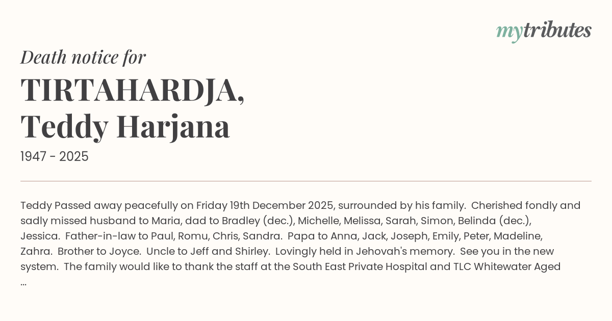 15°CTeddy Passed away peacefully on Friday 19th December 2025, surrounded by his family. Cherished fondly and sadly missed husband to Maria, dad to Bradley (dec.), Michelle, Melissa, Sarah, Simon, Belinda (dec.), Jessica. Father-in-law to Paul, Romu, Chris, Sandra. Papa to Anna, Jack, Joseph, Emily, Peter, Madeline, Zahra. Brother to Joyce. Uncle to Jeff and Shirley.
