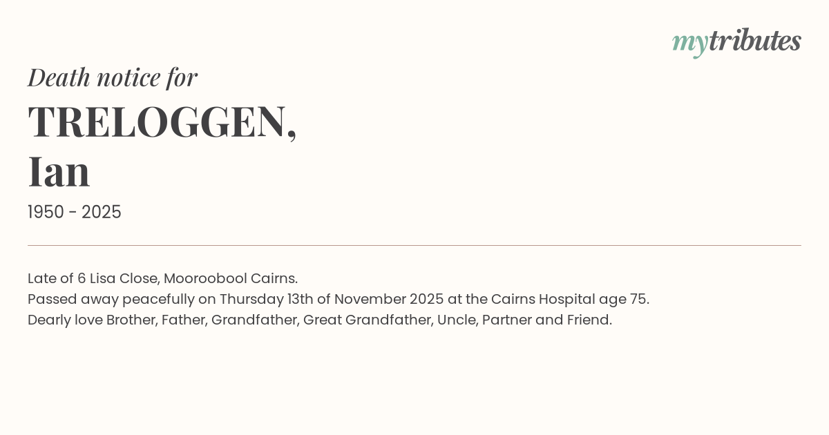 Passed away peacefully on Thursday 13th of November 2025 at the Cairns Hospital age 75.