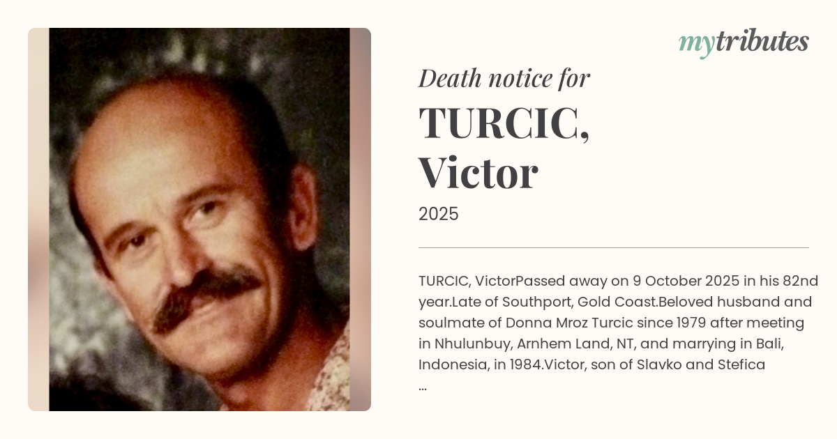 Beloved husband and soulmate of Donna Mroz Turcic since 1979 after meeting in Nhulunbuy, Arnhem Land, NT, and marrying in Bali, Indonesia, in 1984.