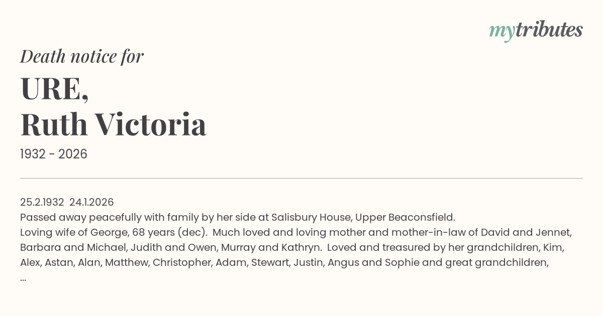 Loving wife of George, 68 years (dec). Much loved and loving mother and mother-in-law of David and Jennet, Barbara and Michael, Judith and Owen, Murray and Kathryn. Loved and treasured by her grandchildren, Kim, Alex, Astan, Alan, Matthew, Christopher, Adam, Stewart, Justin, Angus and Sophie and great grandchildren, Evelyn, Tyler, Declan, Isaac, Morgan, James, Elliot, Finley and Callan.