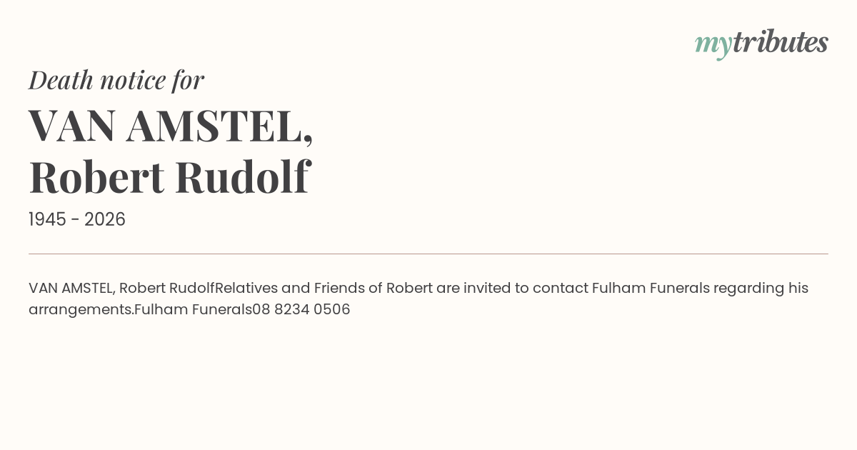Relatives and Friends of Robert are invited to contact Fulham Funerals regarding his arrangements.