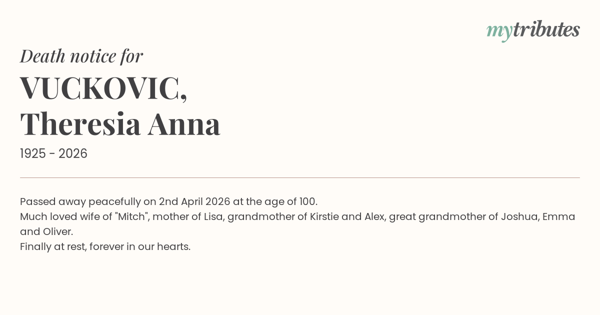 15°CPassed away peacefully on 2nd April 2026 at the age of 100.